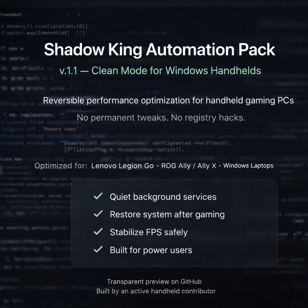 Complete optimization tookit for Legion Go, ROG Ally, and Windows gaming PCs. Includes performance profiles, safety restore, and clean session launcher.